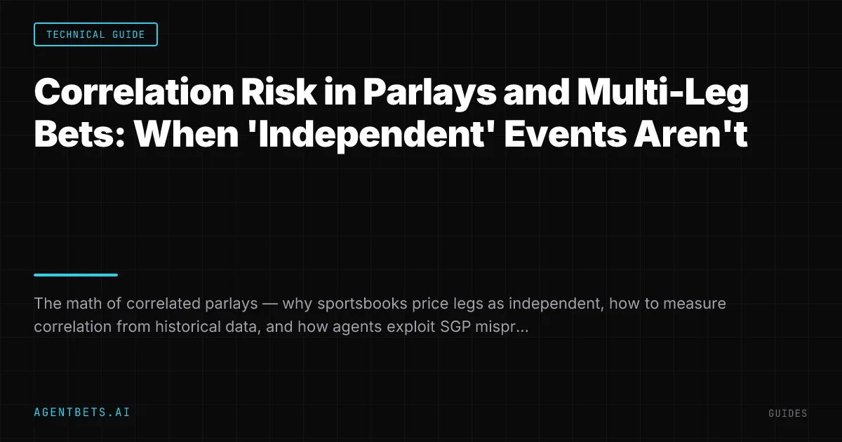 - Portfolio-level correlation: Correlation and Portfolio Theory for Multi-Market Agents covers how to build diversified portfolios of bets across markets, using the same correlation math applied at the portfolio level rather than the single-parlay level.