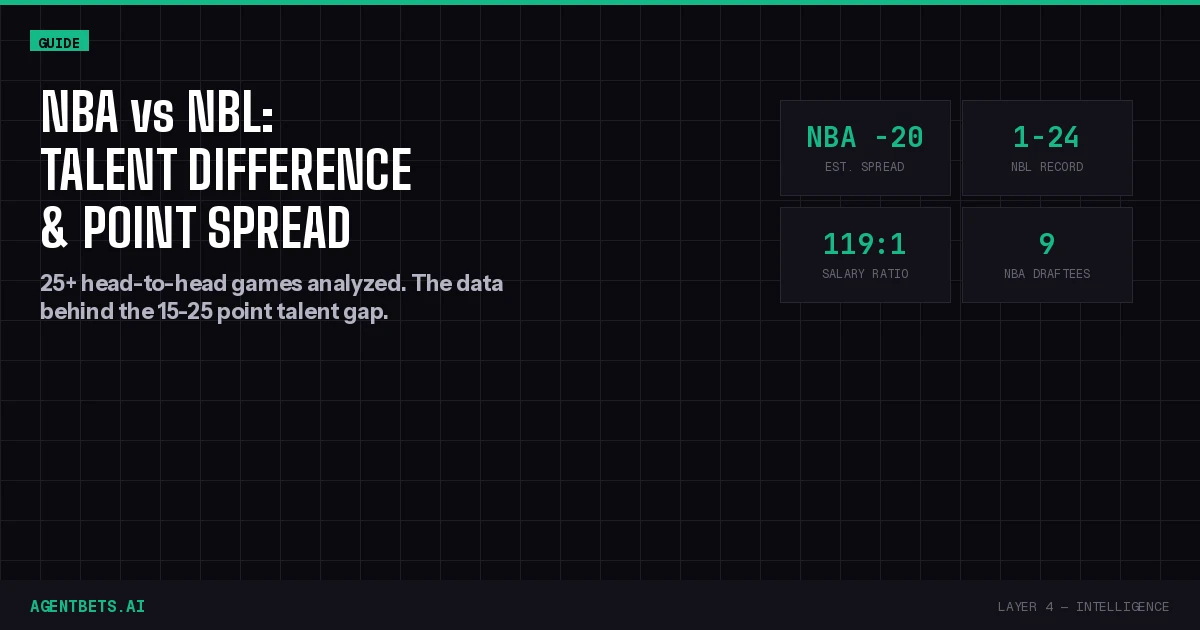 The NBA-NBL talent gap is real, structural, and primarily driven by a ~100:1 salary differential. The typical point spread is 15-25 points, with the exact number depending on NBA lineup intensity and the specific NBL team. The NBL’s real value isn’t in competing head-to-head with the NBA — it’s as a development league, a betting market with exploitable inefficiencies, and a data source that most models underweight.