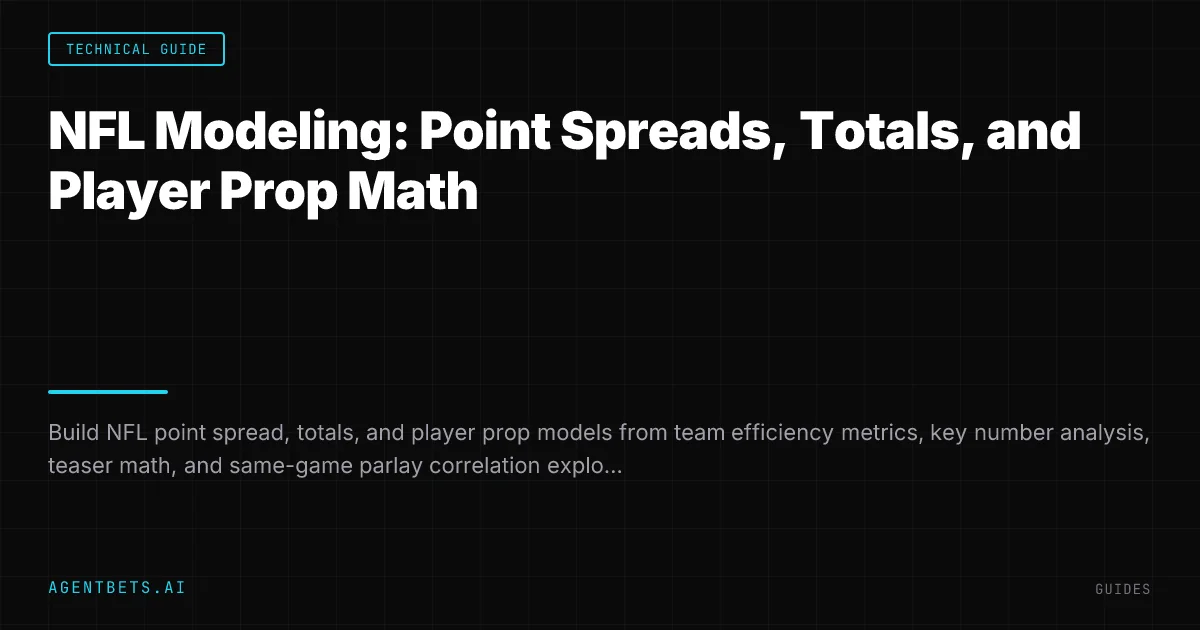 NFL spread modeling starts with EPA/play and DVOA efficiency metrics. Predicted Spread = (Home EPA/play - Away EPA/play) x Plays + HFA. The NFL side market is brutally efficient — edges live in player props, teasers crossing key numbers (3 and 7), and early-week lines before sharp action arrives.