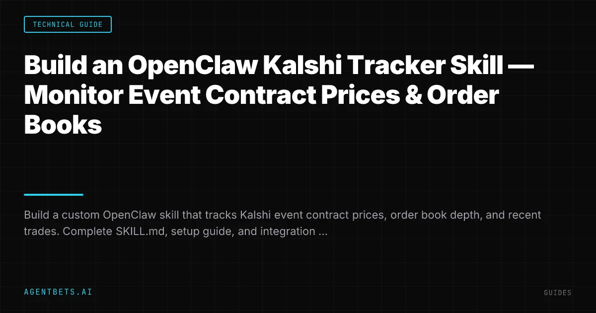 This guide builds kalshi-tracker — a Layer 3 (Trading) skill that handles Kalshi market surveillance as part of the Agent Betting Stack. The skill fetches contract prices via the Kalshi Public API, converts them to American odds for cross-platform comparison, and monitors order book depth so your agent can assess liquidity before flagging opportunities.