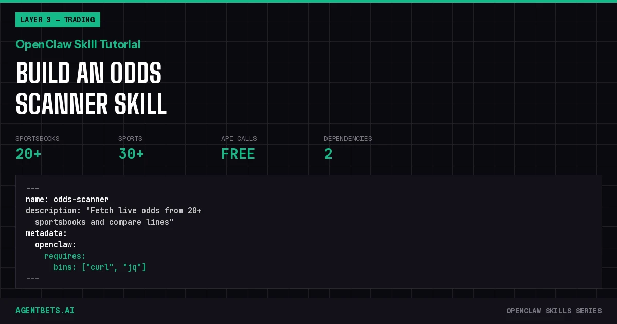This guide builds odds-scanner — a Layer 3 (Trading) skill that handles the price discovery step of the Agent Betting Stack. The skill fetches live odds via The Odds API, formats them for agent consumption, and sets up the data pipeline for downstream skills like vig calculation and arb detection.