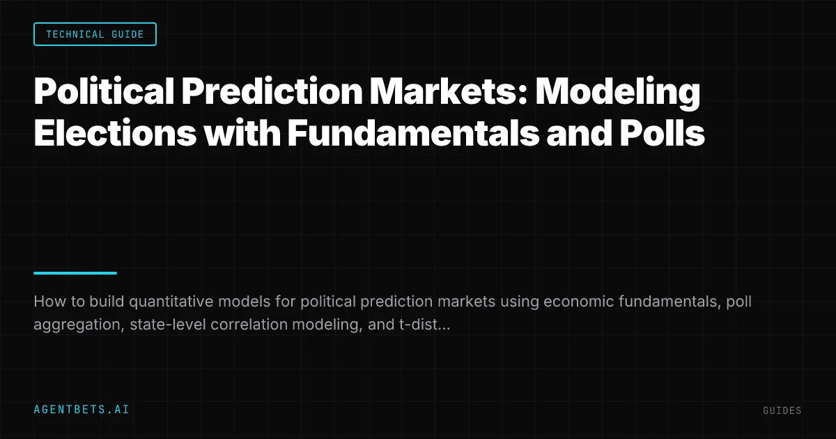 Political prediction markets are the highest-volume category on Polymarket. Model them with two inputs: economic fundamentals (GDP, unemployment, inflation) for the baseline and inverse-variance weighted poll aggregation for the signal. Convert poll margins to win probabilities using a t-distribution (df=4-8), not a normal distribution — elections have fat tails. State-level correlations (rho ~ 0.75 between swing states) mean you must model joint probabilities, not individual races in isolation.