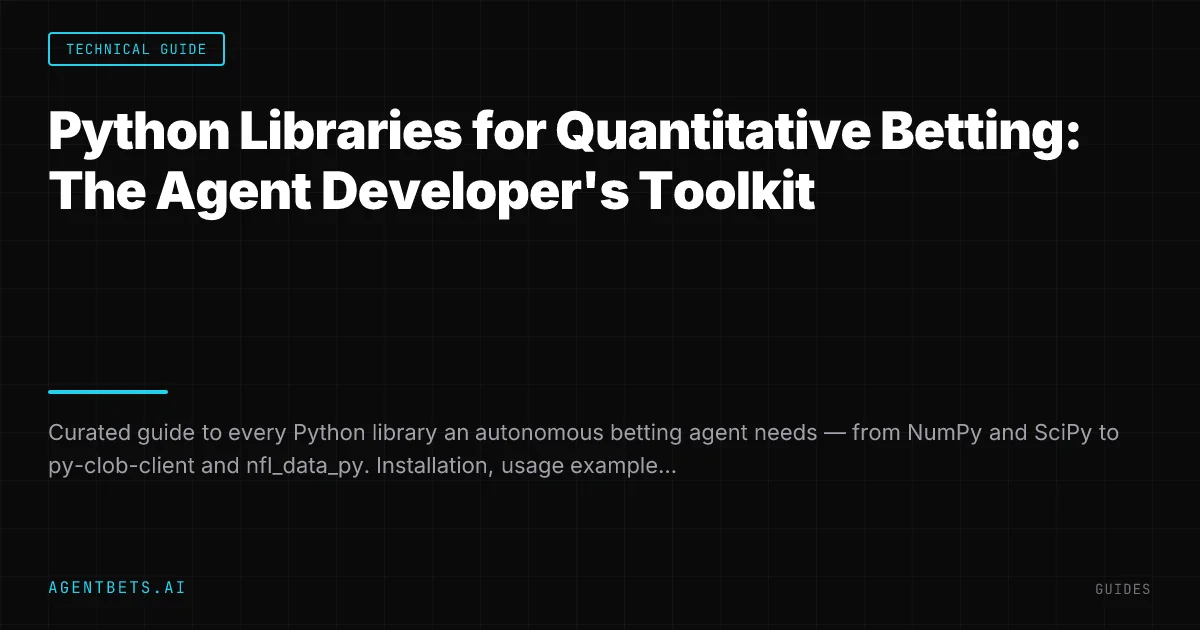 This guide maps the entire Python ecosystem for quantitative betting to the Agent Betting Stack. Every library listed here fills a specific role across the four layers: Layer 1 (Data) ingestion and cleaning, Layer 2 (Wallet) bankroll and risk management, Layer 3 (Trading) API connectivity and order execution, and Layer 4 (Intelligence) modeling and decision logic. The goal is to give an agent developer the exact pip install commands and 5-line usage snippets to get each library running in the context of a betting system — no guessing, no Stack Overflow rabbit holes.