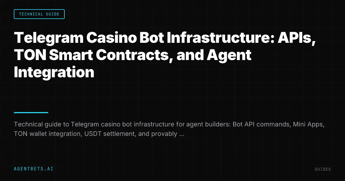 This guide covers the three layers of Telegram casino infrastructure that matter for agent builders, how they map to the Agent Betting Stack, and where the integration points are.