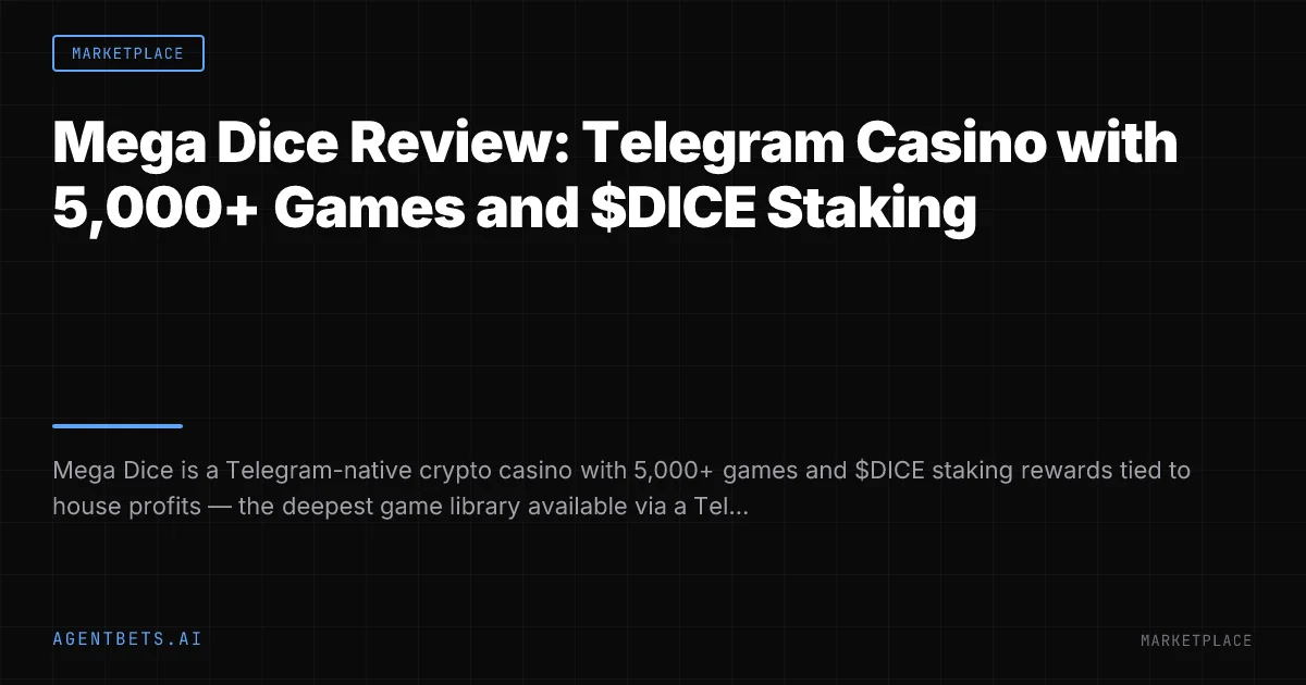 Mega Dice is the deepest Telegram casino by game count — 5,000+ titles accessible via bot commands, with $DICE staking rewards paid from house profits. For agents designed to find edge in specific game types, the library breadth is the differentiator.