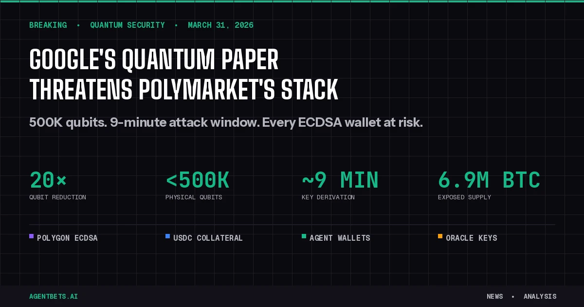 Google Quantum AI published a whitepaper on March 31, 2026 showing that cracking the elliptic curve cryptography securing Bitcoin and Ethereum wallets could require fewer than 500,000 physical qubits — a 20x reduction from prior estimates. The implications ripple directly into Polymarket’s settlement layer, wallet infrastructure, USDC collateral, and the autonomous agents trading on it.