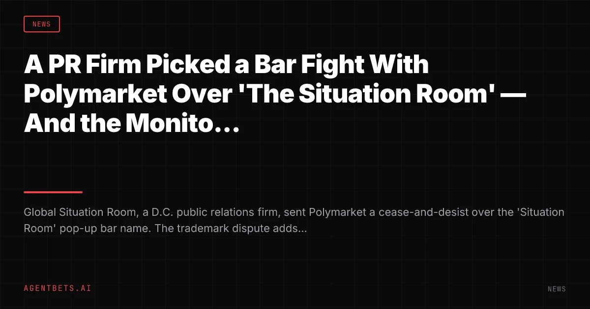A D.C. public relations firm called Global Situation Room hit Polymarket with a cease-and-desist over the name of its pop-up bar. The prediction market giant pushed ahead anyway — only to have every screen in the building go dark on opening night. You genuinely can’t make this stuff up.