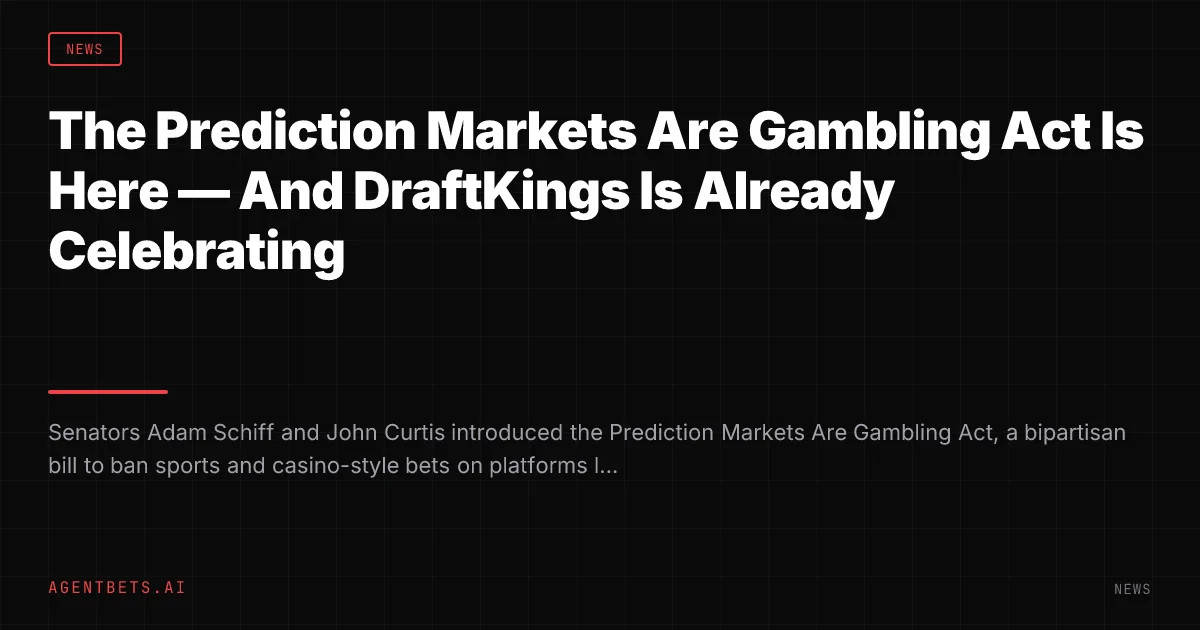Senators Adam Schiff and John Curtis just introduced the Prediction Markets Are Gambling Act — a bipartisan bill to ban sports and casino-style bets on platforms like Kalshi and Polymarket. DraftKings and FanDuel stocks immediately surged 8%. When your competitors’ stock pops because Congress is coming for you, the regulatory picture has shifted.