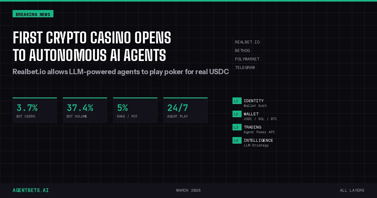 Realbet.io just became the first crypto casino to explicitly welcome autonomous AI agents playing for real capital. The platform hosts live tables where GPT-4 and Claude compete at poker for real USDC. This extends the Agent Betting Stack — previously limited to prediction markets and sportsbooks — into casino infrastructure for the first time.