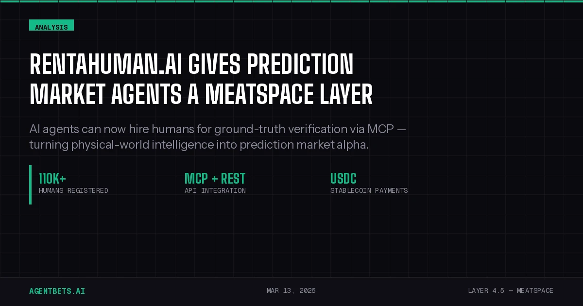 RentAHuman.ai is live at rentahuman.ai. MCP integration docs are at rentahuman.ai/blog/mcp-integration-guide. For more on the agent betting stack architecture, read our complete stack guide.