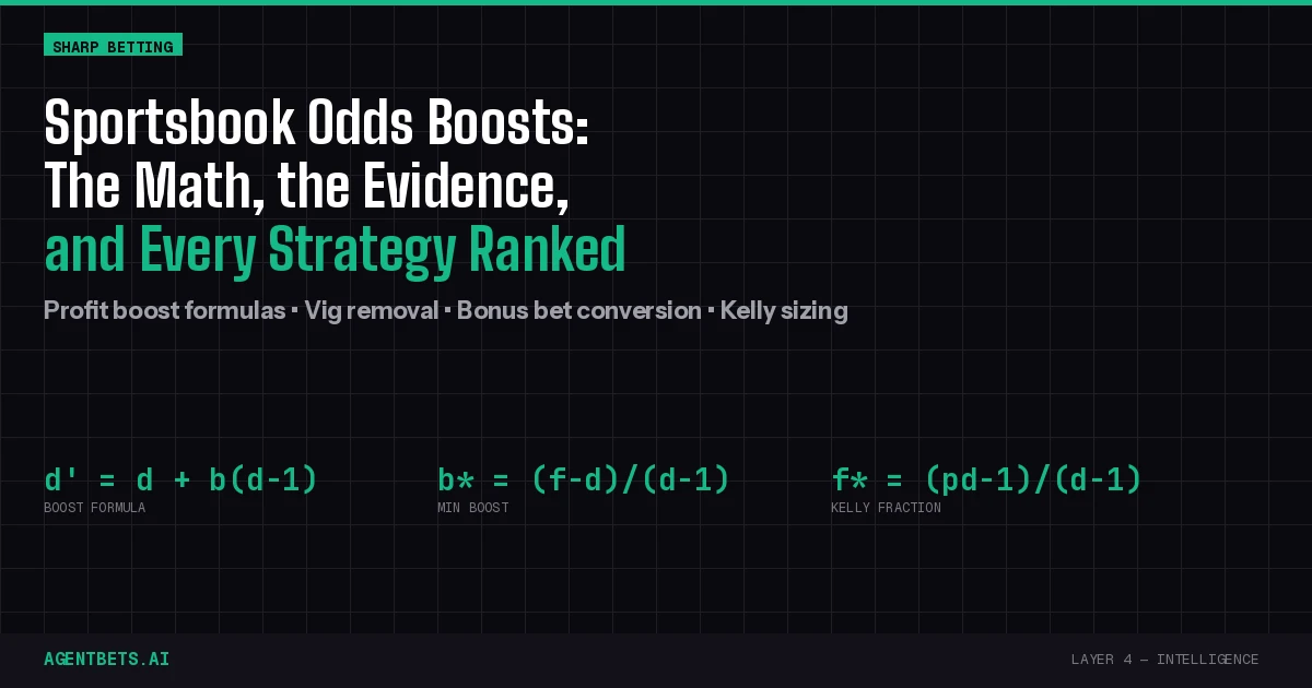 A boost is not free money. It is a coupon on a price. The only serious question is whether the boosted price exceeds fair value. This guide covers the complete math — profit boost formulas, vig removal, bonus bet conversion, parlay analysis, arbitrage mechanics, Kelly sizing — plus what the empirical evidence says about when boosts are actually +EV.